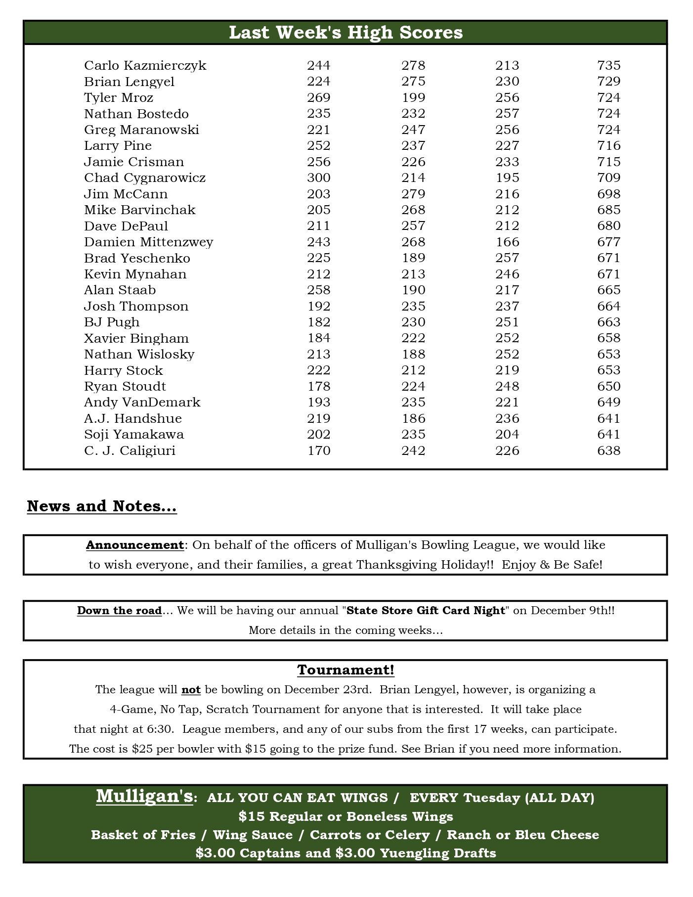 Mulligan's Bowling League